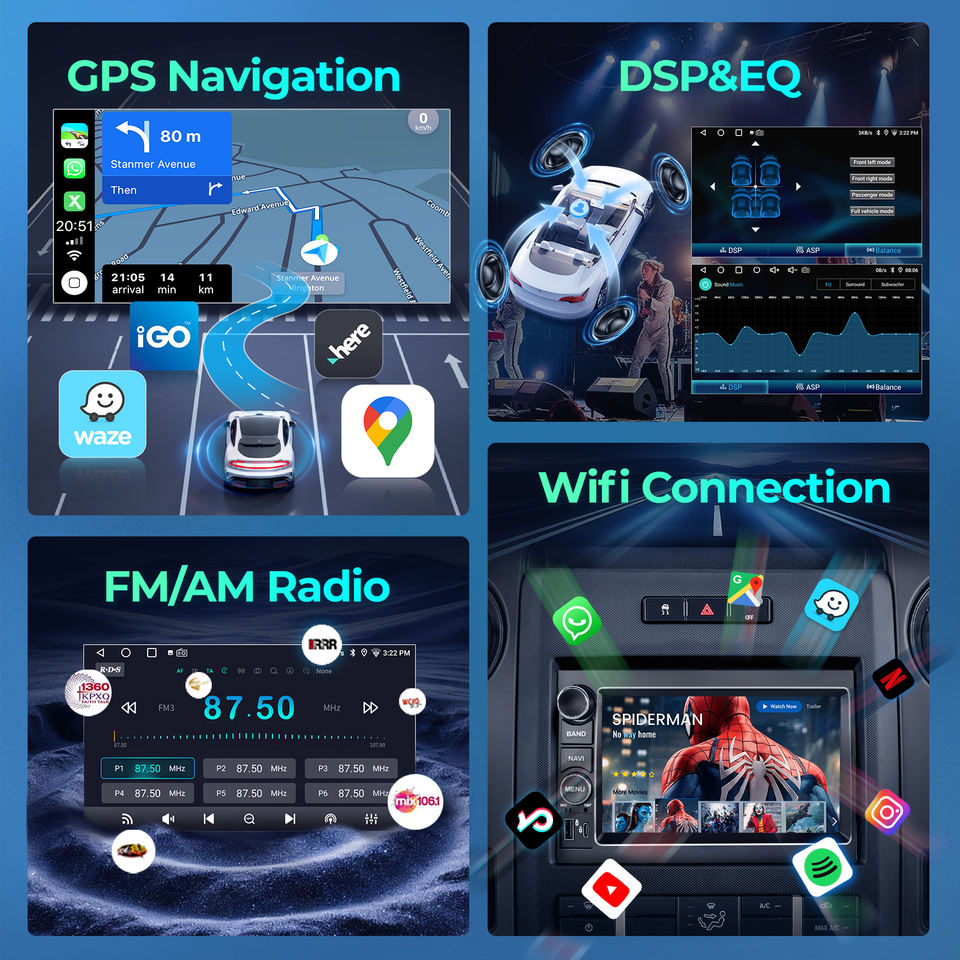 GPS, Stéréo, SANS MAINS, RVB, Télécommande, Amplificateur, DSP, CarPlay, Android auto, Image dans l'image, Microphone intégré, Écran partagé, Gestionnaire de fichiers, Couple Pro, Hi-Res Audio, Volant de voiture de Contrôle, Haut-parleur intégré