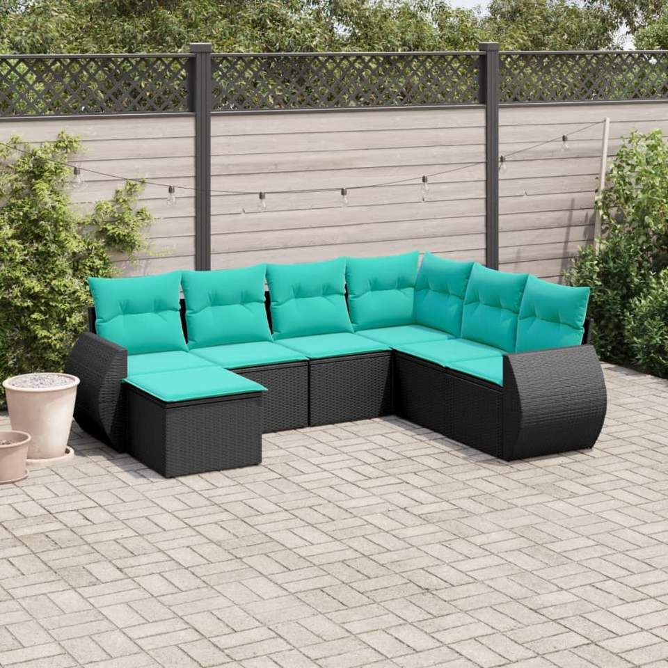 Ensemble de canapés de patio en polyrotin noir, 7 pièces, avec coussins, meubles d'extérieur, sièges de style contemporain, pour 7 personnes