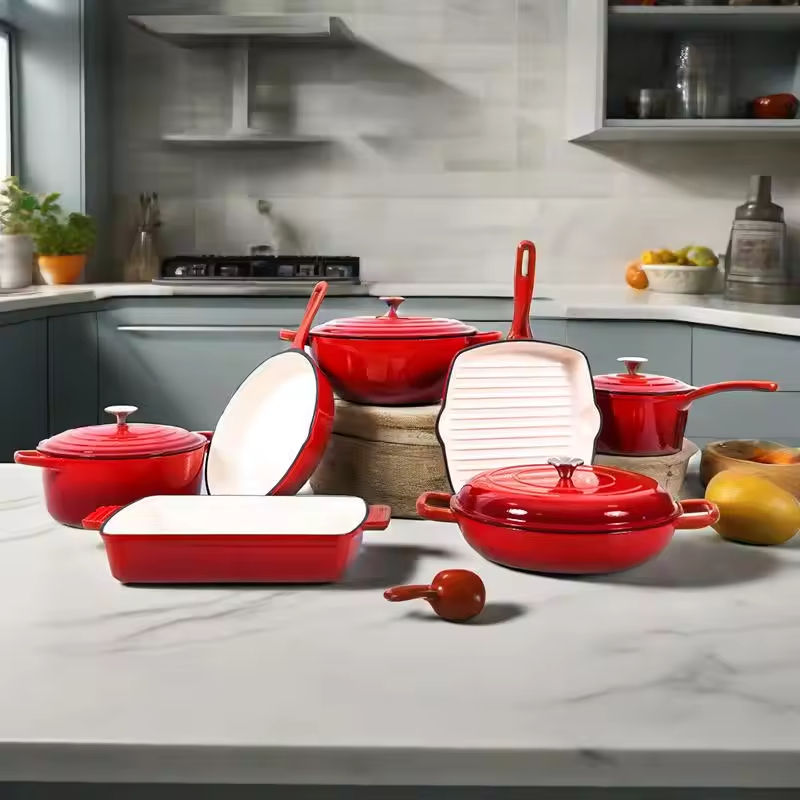 Ensemble de 7 casseroles hollandaises modernes en fonte émaillée antiadhésives avec couvercles en verre pour la cuisson du pain et les ustensiles de cuisson sur plaque de cuisson