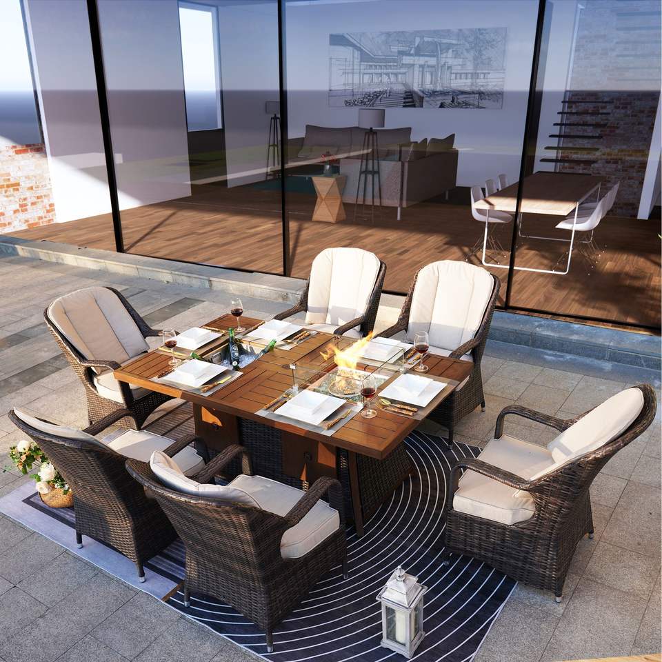 Ensemble de salle à manger de jardin 7 pièces avec foyer au gaz et bac à glace, table rectangulaire et 6 chaises hauteur standard pour usage extérieur