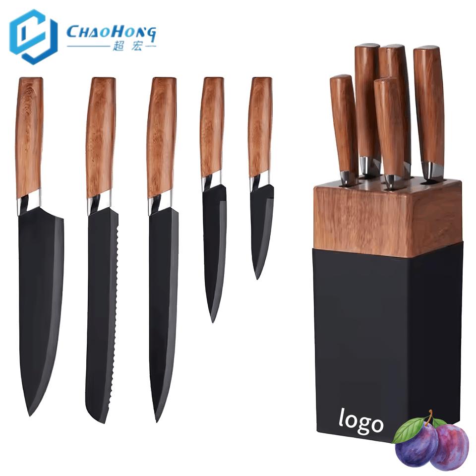 Ensemble de 7 couteaux de cuisine haut de gamme en acier inoxydable avec bloc, couteau de chef super tranchant personnalisé et éplucheur en plastique PP