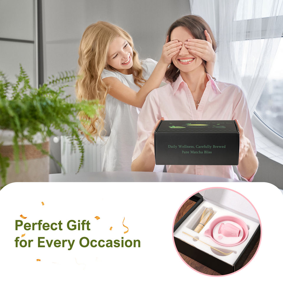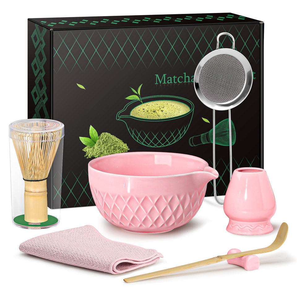 Ensemble de thé matcha traditionnel en céramique rose 7 pièces avec bol en forme de losange, fouet en bambou, cuillère à thé pour les amateurs de thé