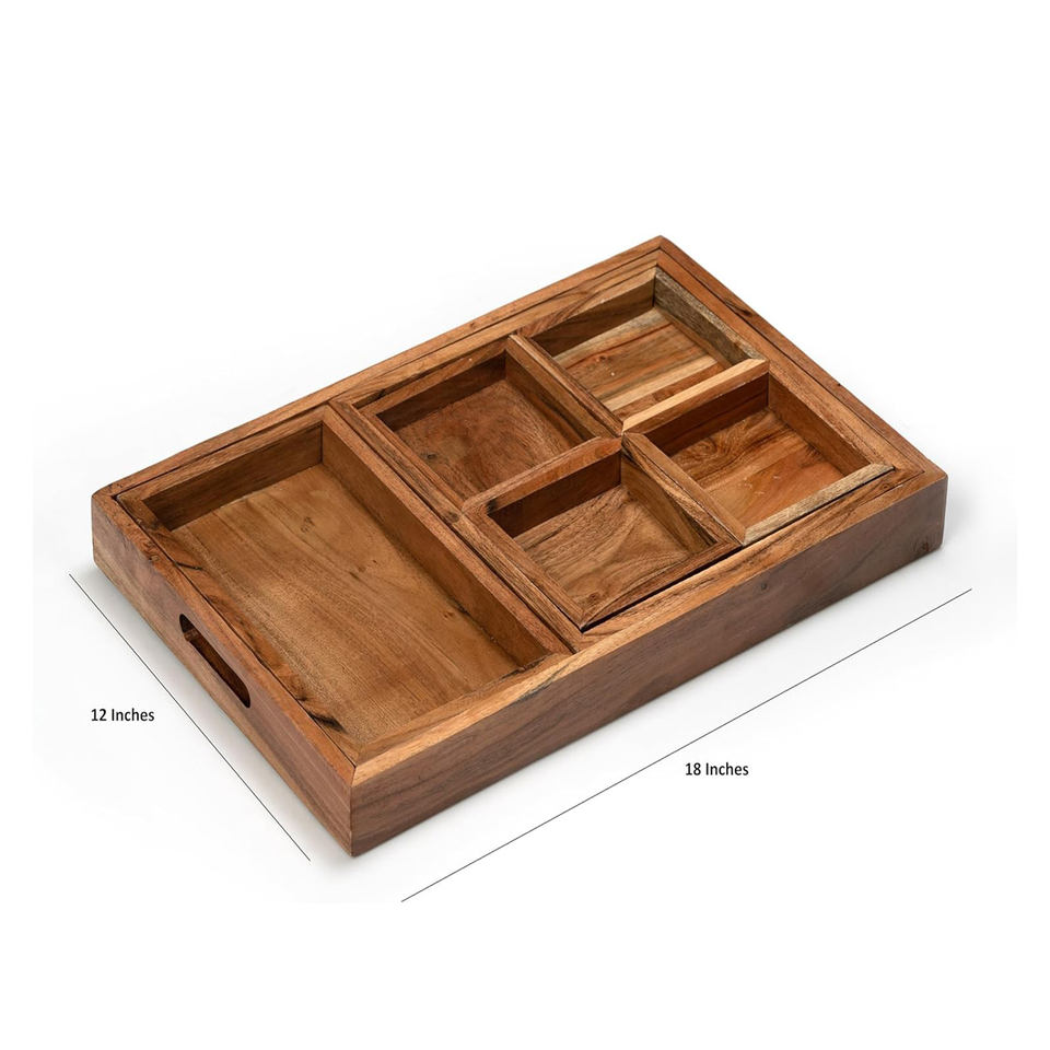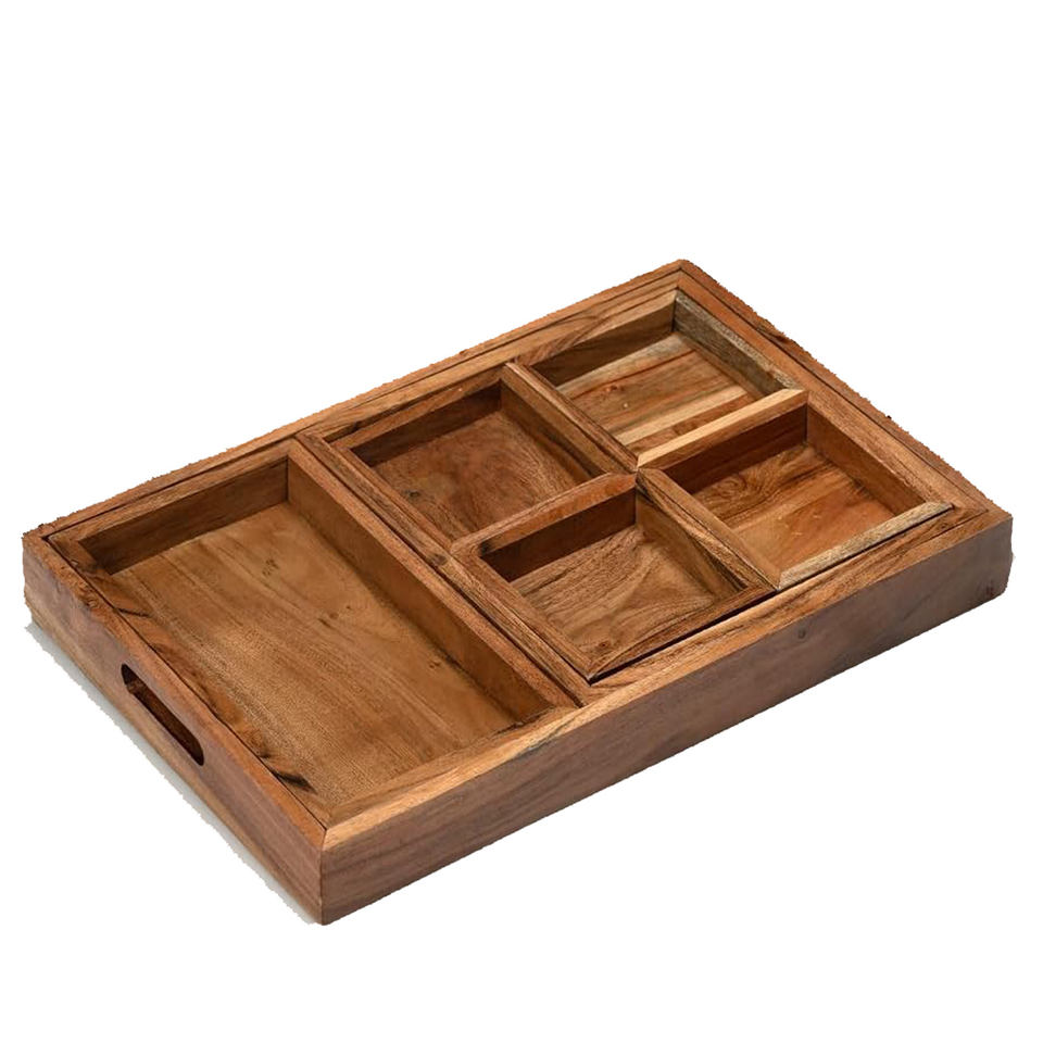 Nom du produit:Plateaux de service en bois d'acacia avec poignées l Ensemble de 7