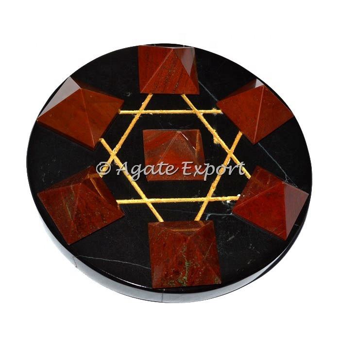 Pyramide en jaspe rouge sur étoile de David dorée avec base noire, pierre précieuse de guérison Feng Shui