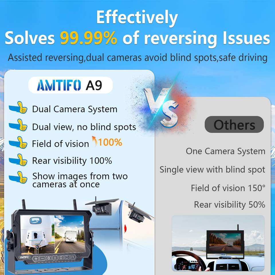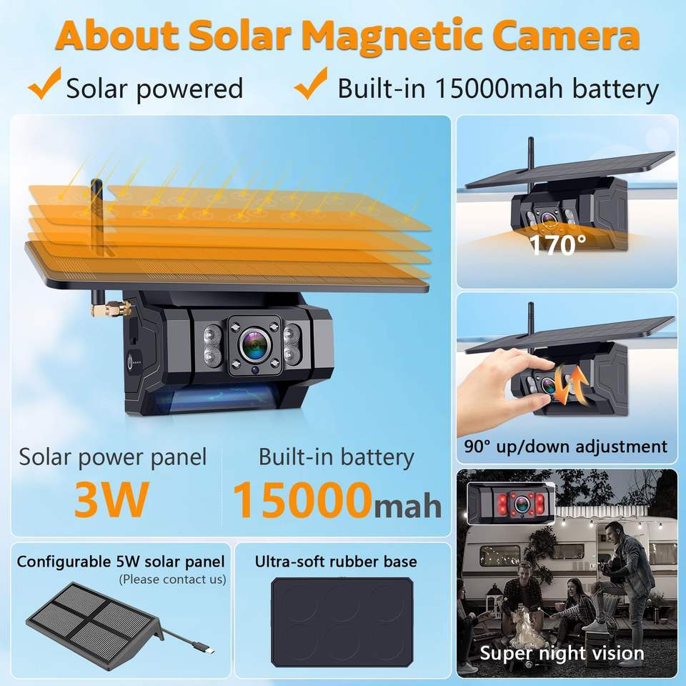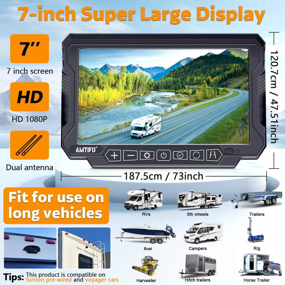 Système de caméra de recul solaire sans fil 7 '', 2 caméras étanches magnétiques IP6gk, moniteur sans installation pour camion remorque RV