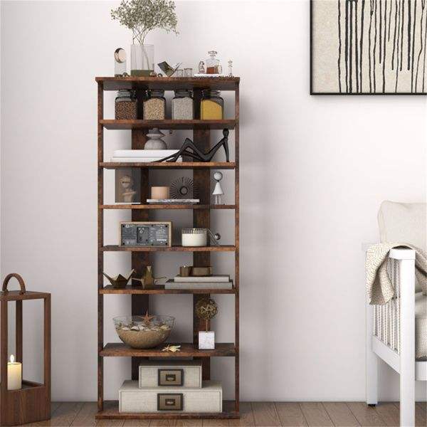 Étagère à chaussures rustique marron à 7 niveaux, double rangée avec étagères réglables, anti-basculement, étroite, pour entrées et placards