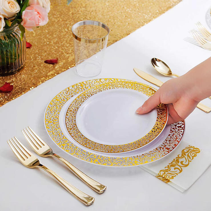 Ensemble de 70, 175, 350 ou 700 pièces : Assiettes jetables, verres à vin, couteaux, fourchettes et cuillères en plastique rigide PS, bordure or rose, design ajouré