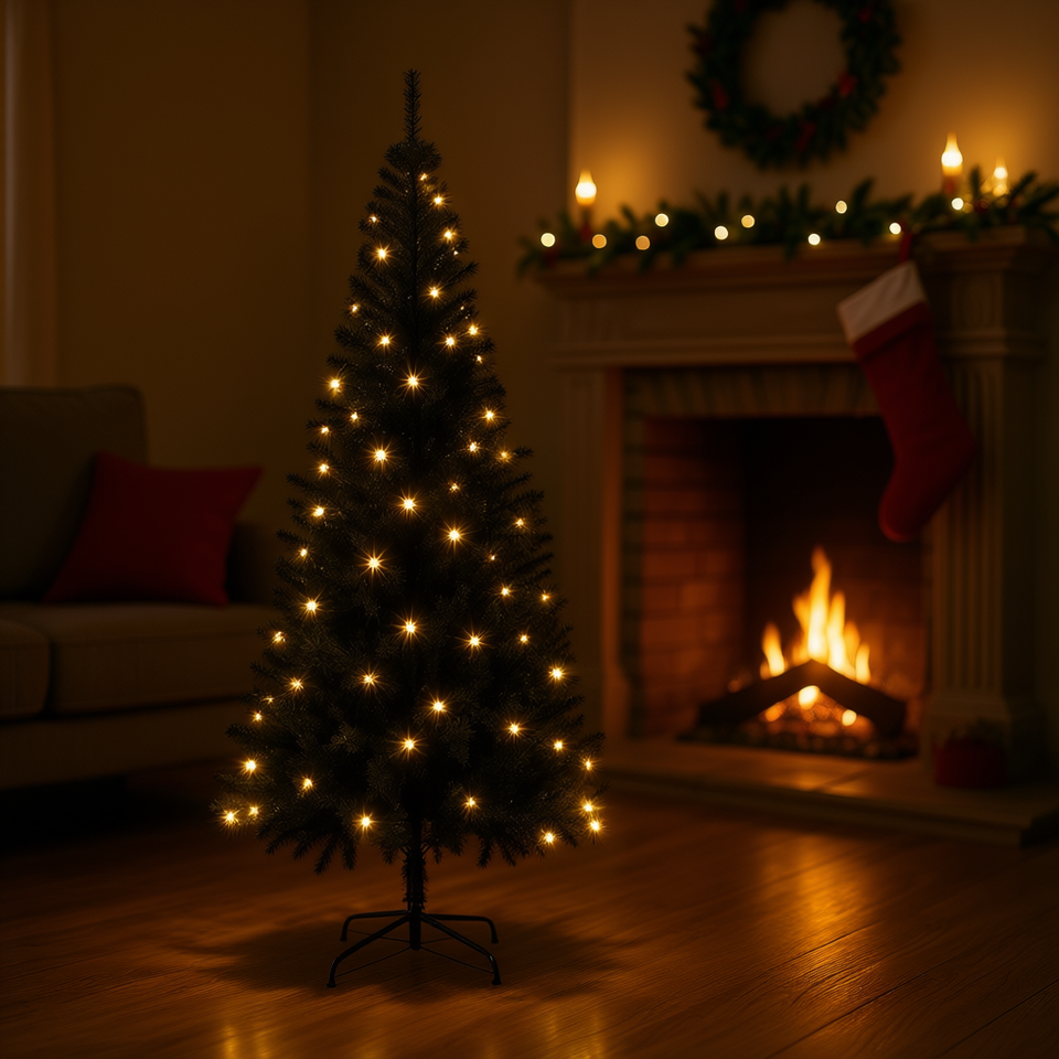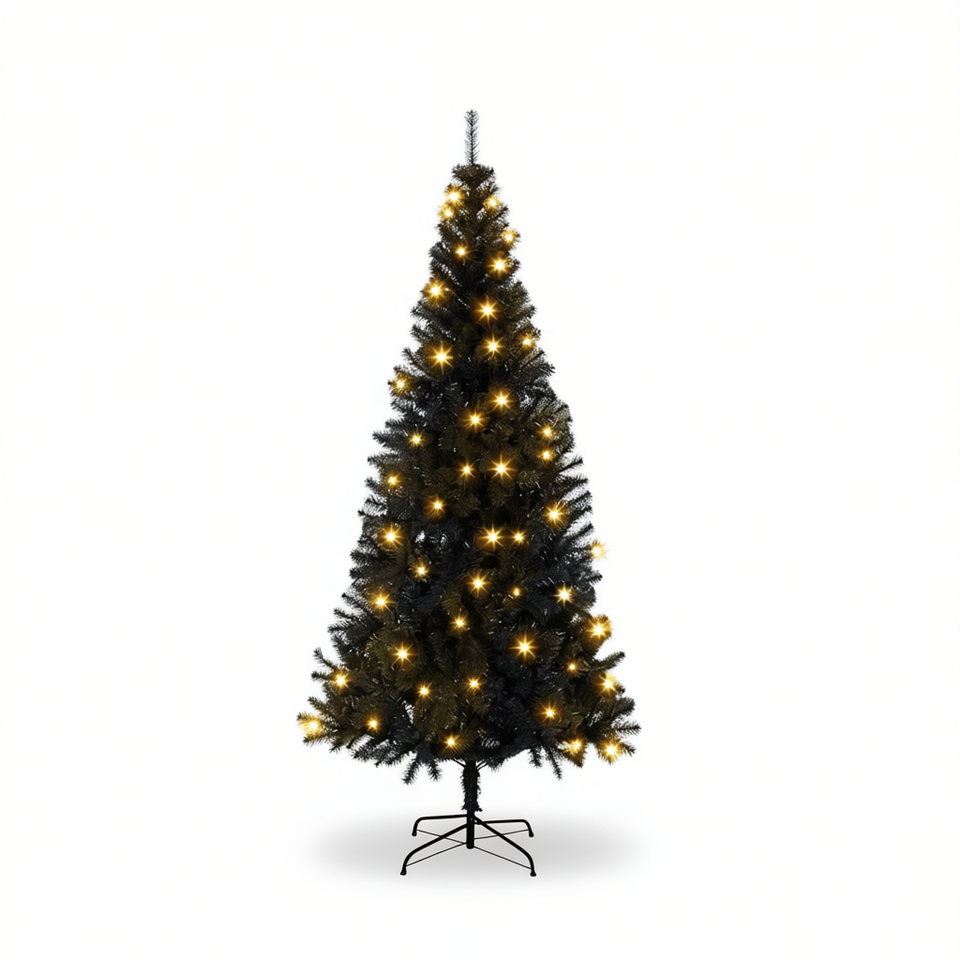 Sapin de Noël en PVC noir de 70,9 pouces avec 300 lumières LED blanc chaud, décorations festives