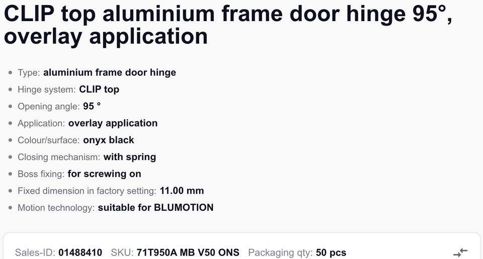 Charnière Blum1 71T950A pour portes d'armoires à cadre en aluminium 95 ° Acier Onyx Noir avec fermeture amortie à ressort pour cuisine/salon