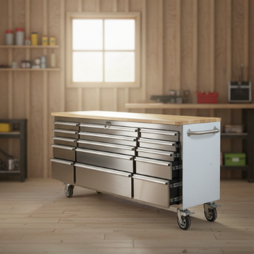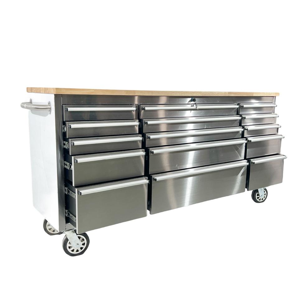 Coffre à outils de 72 pouces pour garage, dessus en bois, 18 tiroirs, chariot, grand meuble à outils avec tiroirs