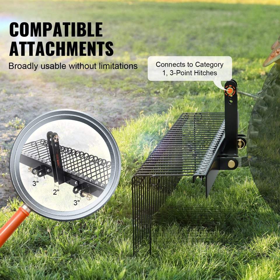 Râteau désherbeur paysager de 72 pouces avec 32 dents en acier, adaptable pour attache 3 points catégorie 1, outil désherbeur de pelouse