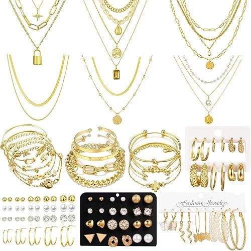 Ensemble de bijoux plaqué or 73 pièces pour femme, comprenant collier, bracelet, chaîne de cheville, boucles d'oreilles clous et créoles, et bracelets à maillons tendance
