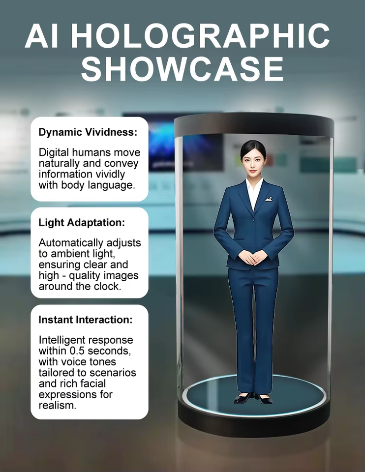 Humain numérique holographique IA de 75 pouces, écran d'assistant virtuel de 2000 nits pour système de guide interactif de hall intelligent