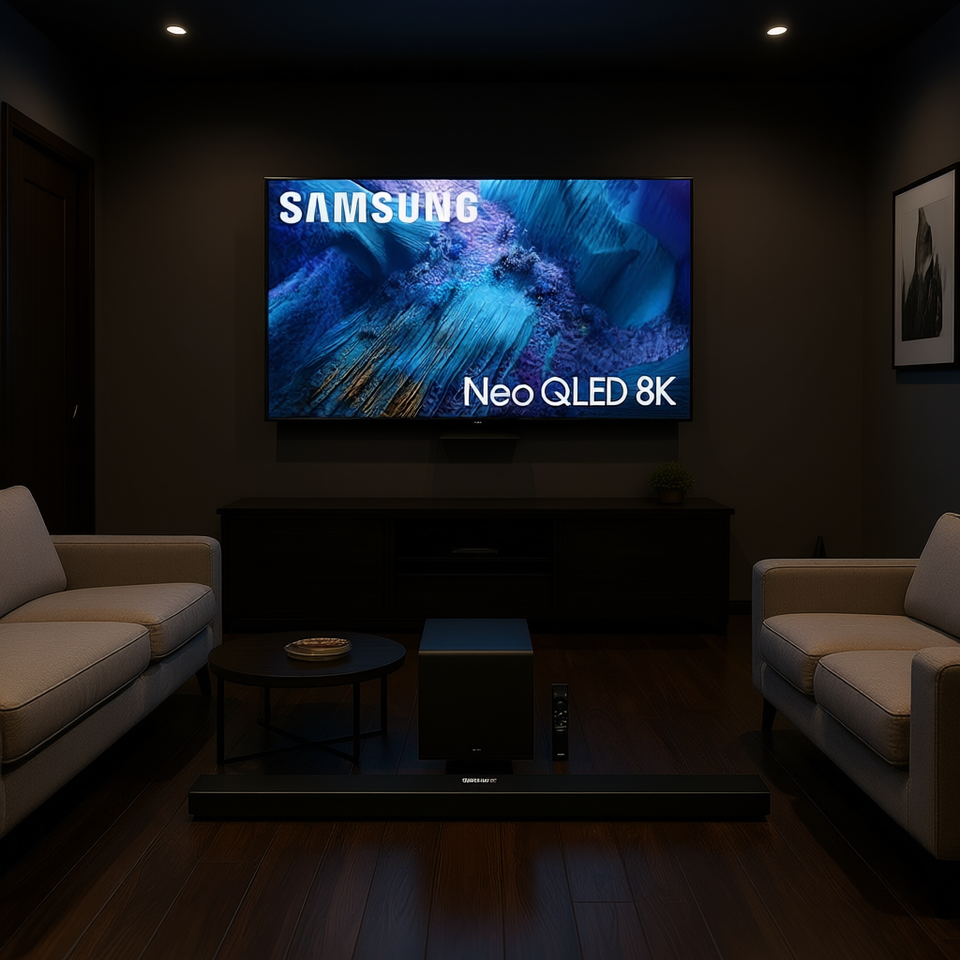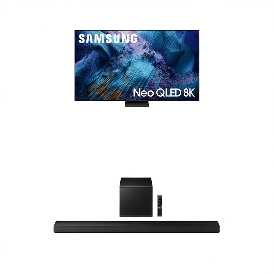 Téléviseur intelligent Mini LED de 75 pouces avec processeur 8K, système de cinéma maison incluant barre de son et caisson de basses