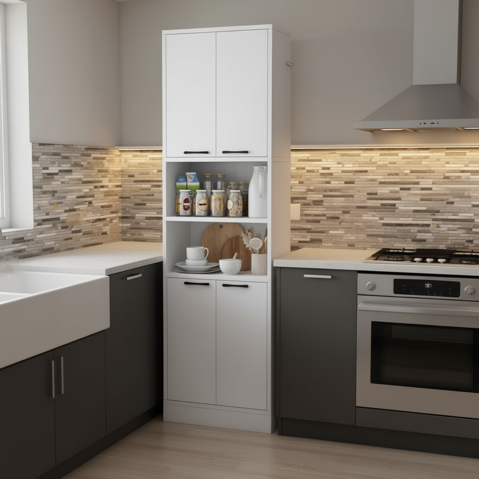 Armoire de cuisine haute de 75 pouces en MDF blanc avec portes et étagères pour rangement et organisation, design moderne