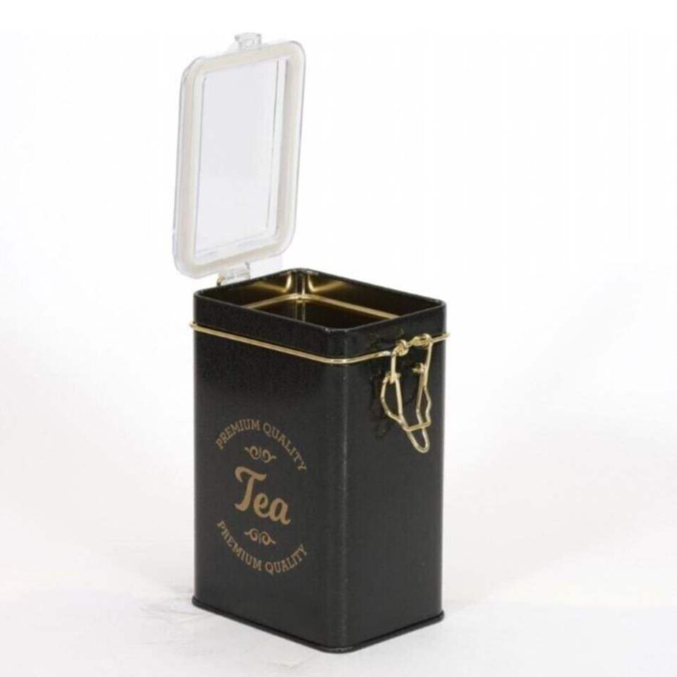 Boîte à thé rectangulaire en métal noir 75x100x150mm avec fermoir en fil de 1L et couvercle transparent