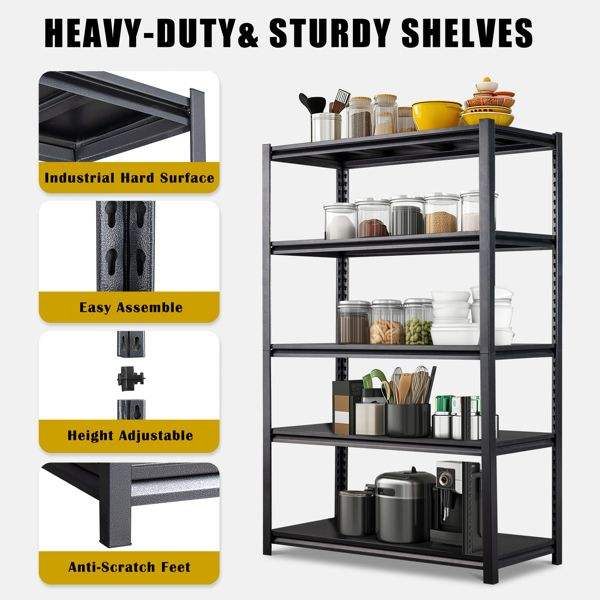 78\" Adjustable Black Heavy Duty Garage Shelves 5-Tier 2200LBS Capacity Metal Utility Storage Organizer Racks for Warehouse