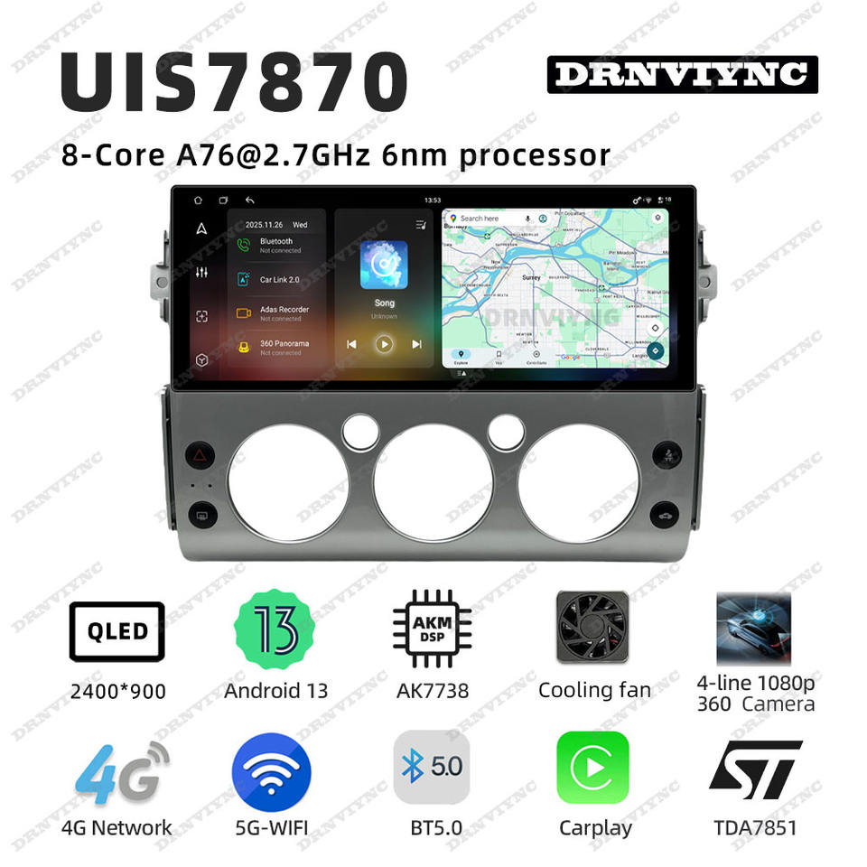 Autoradio Android 7870 12,3 pouces, écran tactile 2K, multimédia, Carplay, GPS, lecteur vidéo stéréo pour Toyota FJ Cruiser 2007-2013