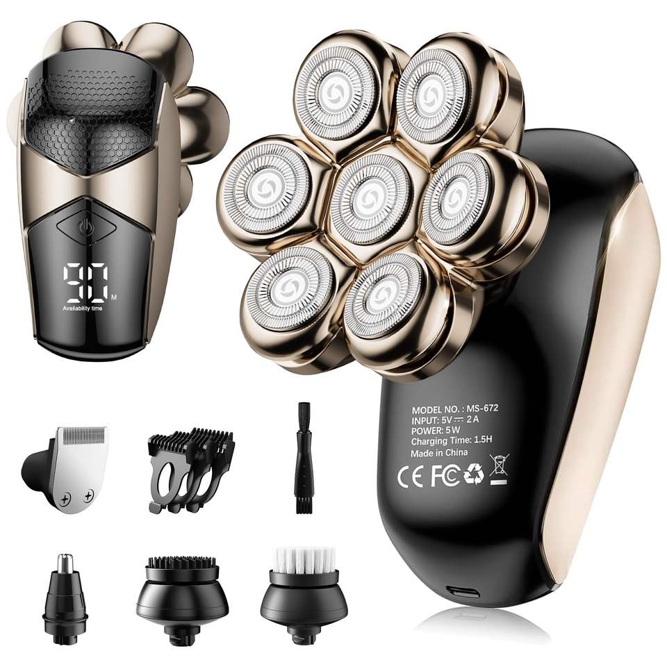 Rasoir électrique rotatif 7D étanche pour hommes, rechargeable par USB-C, avec écran LED, pour le rasage du visage - IPX7