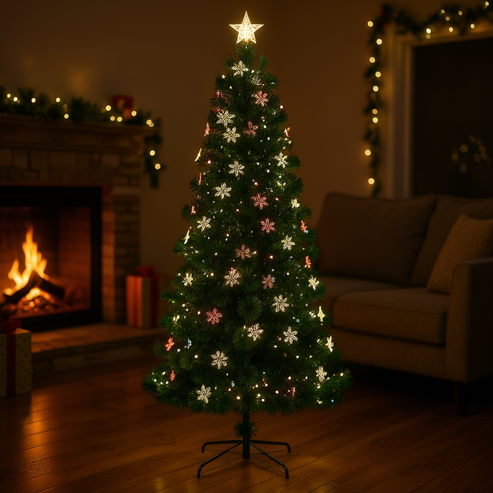 Sapin de Noël artificiel pré-éclairé de 7 pieds, lumières à fibres optiques multicolores, 290 branches, montage facile, décoration intérieure