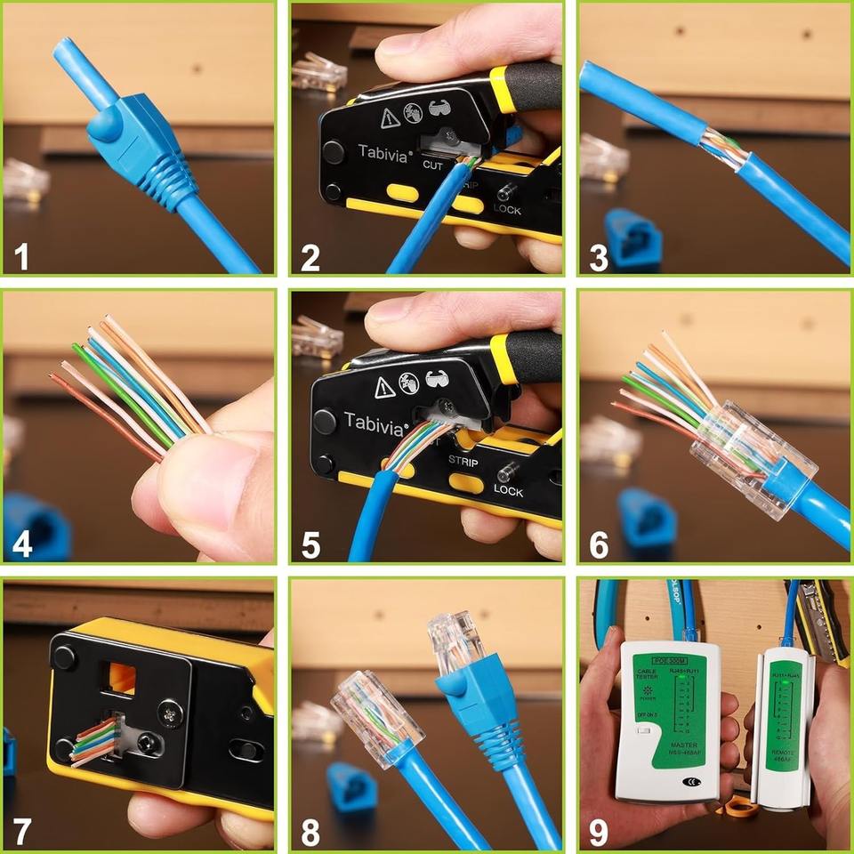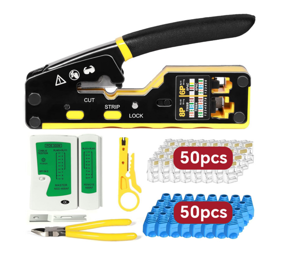 Kit d'outils réseau 7-en-1 avec pince à sertir droite 8P6P, testeur de câble, coupe-câbles, pince à dénuder, connecteur CAT6 et gaine