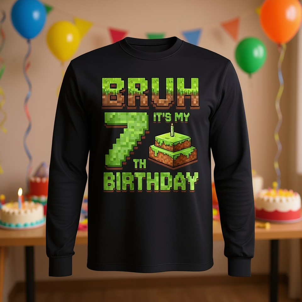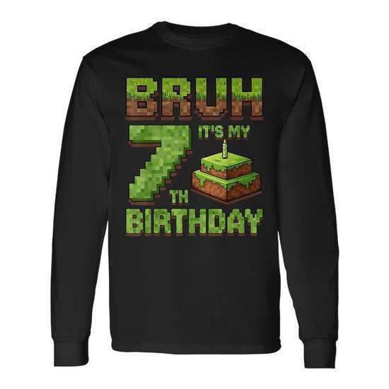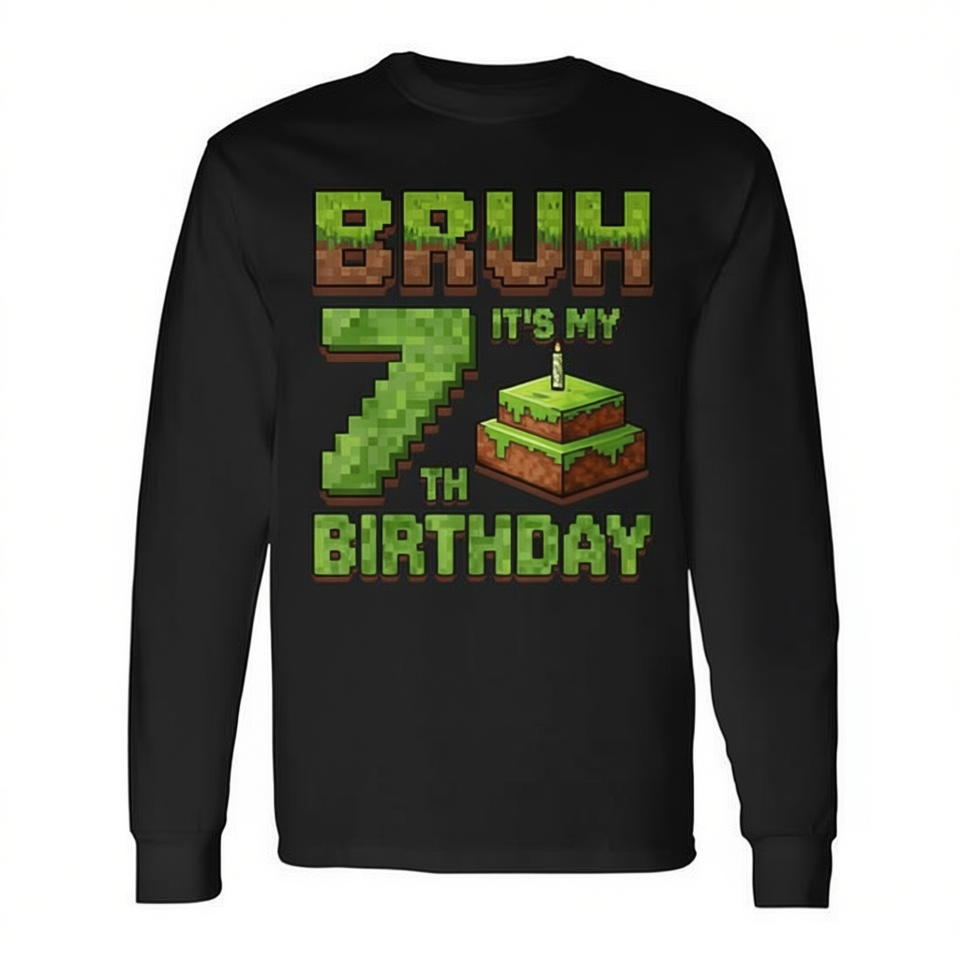 T-shirt à manches longues pour garçons, motif pixel, col rond, en coton, pour fête d'anniversaire, impression numérique, 7e anniversaire