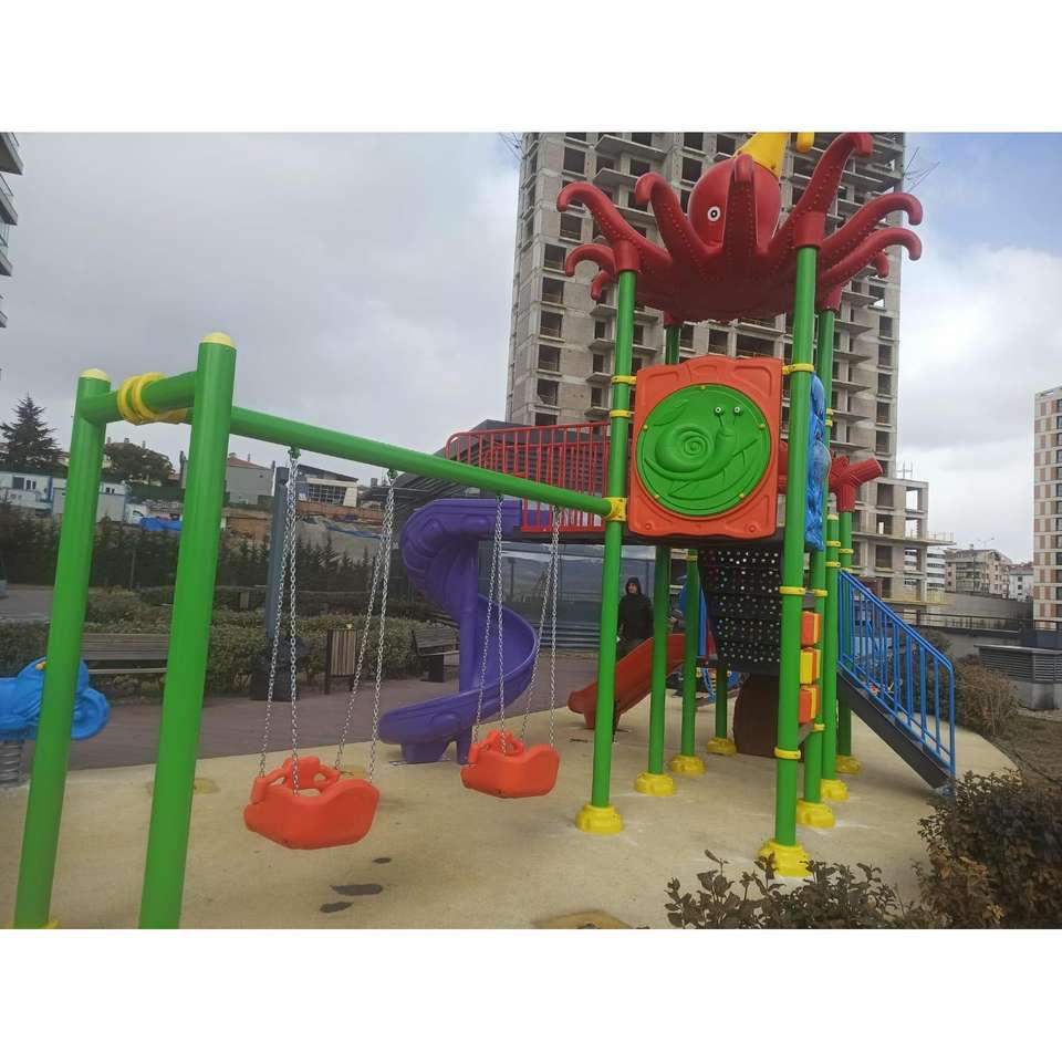 Ensemble d'aire de jeux extérieure de 7x4m avec double toboggans Design de toit de poulpe pivotant sûr pour les enfants Toit en plastique décoratif pour s'amuser