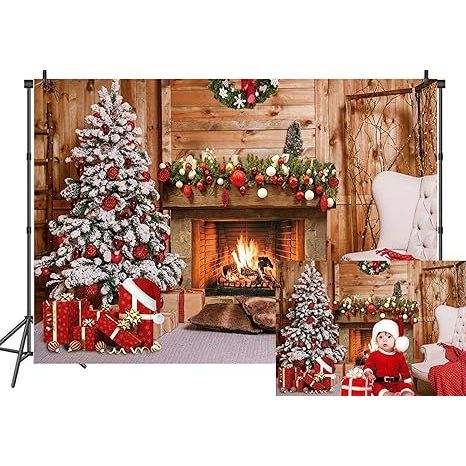 Toile de fond rustique de Noël 7x5 pieds pour photographie, cheminée, arbre, cadeaux, décoration de fête de Noël