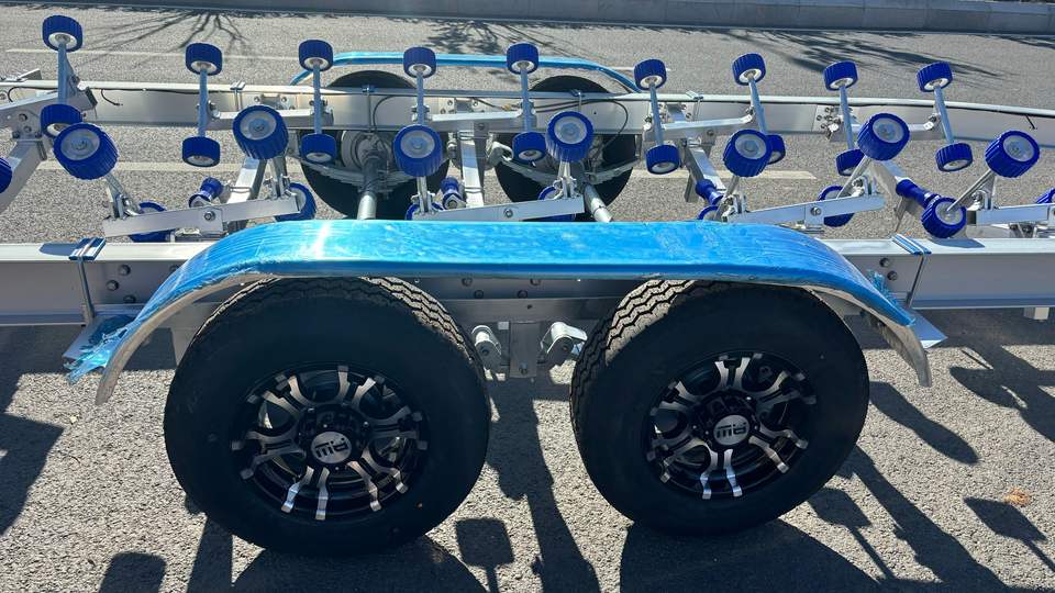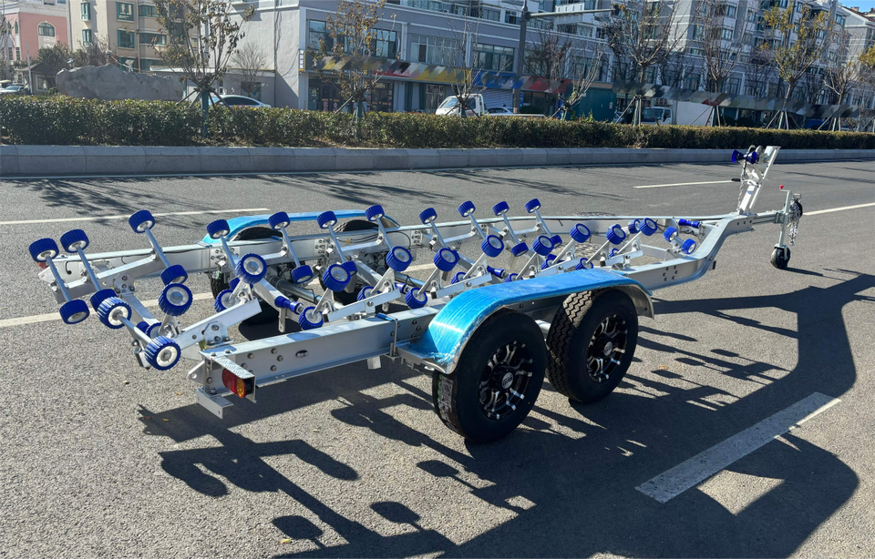 Remorque de bateau en aluminium à essieu tandem à rouleaux oscillants à chargement facile de 8,2 m avec certification VIN CE DOT, adaptée aux bateaux de 7 m