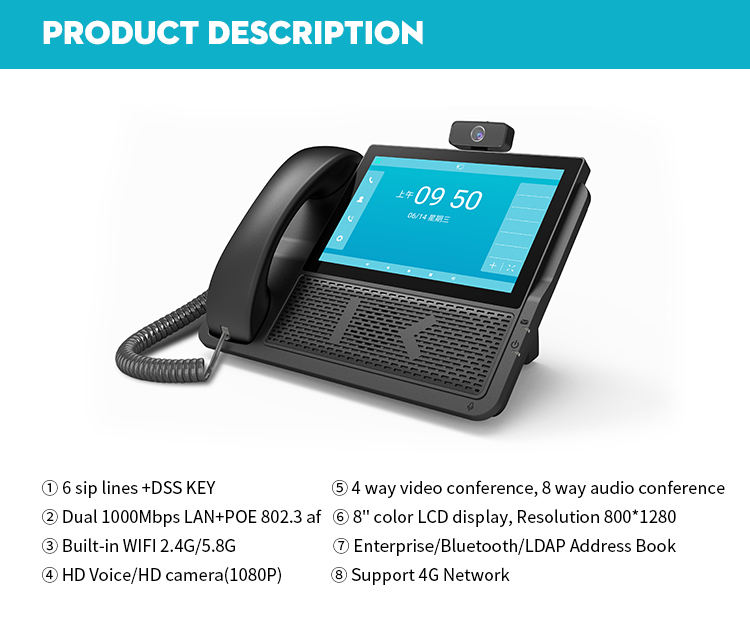 Téléphone IP sans fil 8 "HD pour appartement maison double bande WiFi PSTN carte SIM 4G 1280*800 2 + 16GB haut-parleur appels réseaux GSM POE