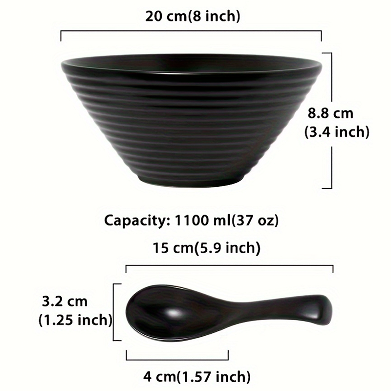 8 Inch Ceramic Vintage Ramen Bowl Set With Spoon Large Noodle Soup Bowl with Spoons for Asian Pho Udon Soba Matting Black