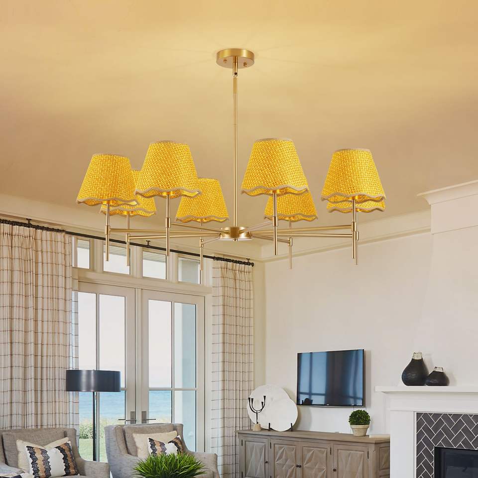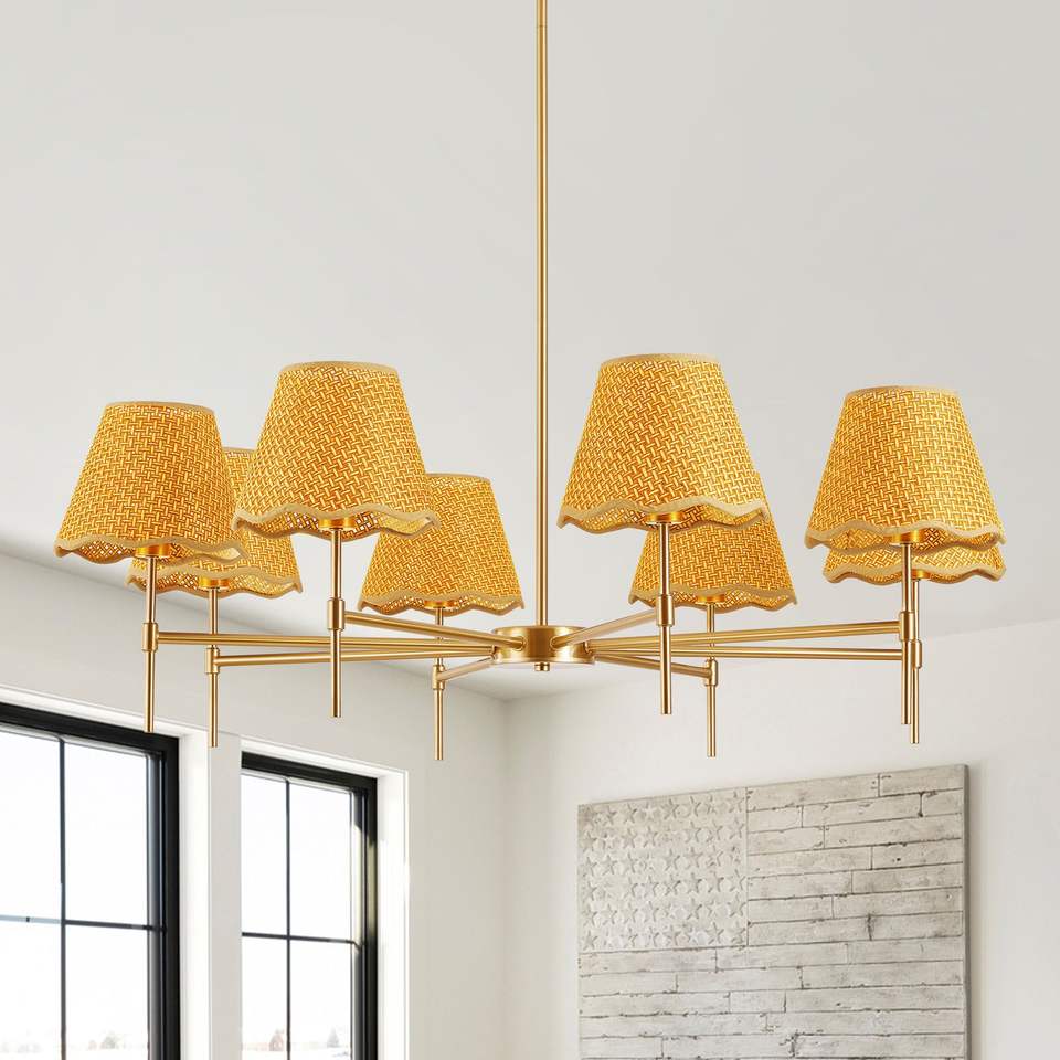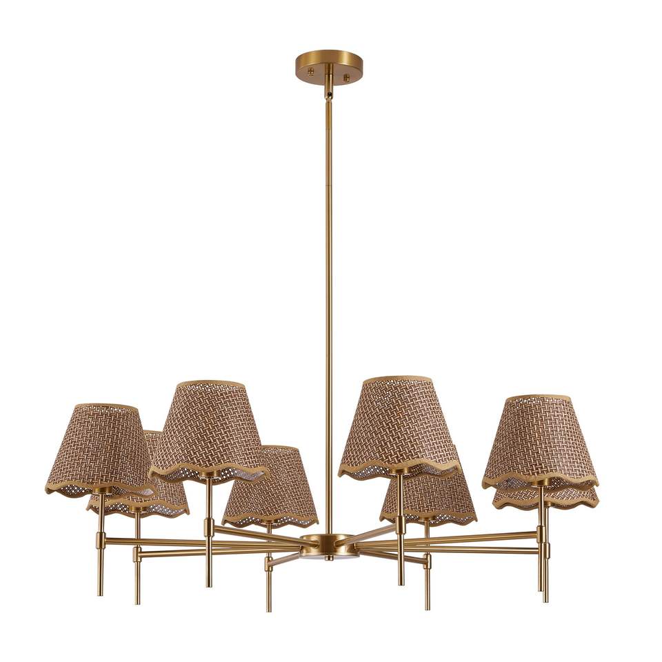 Lustre suspendu rustique en rotin doré à 8 lumières, style bohème, 38,6 cm, réglable en hauteur