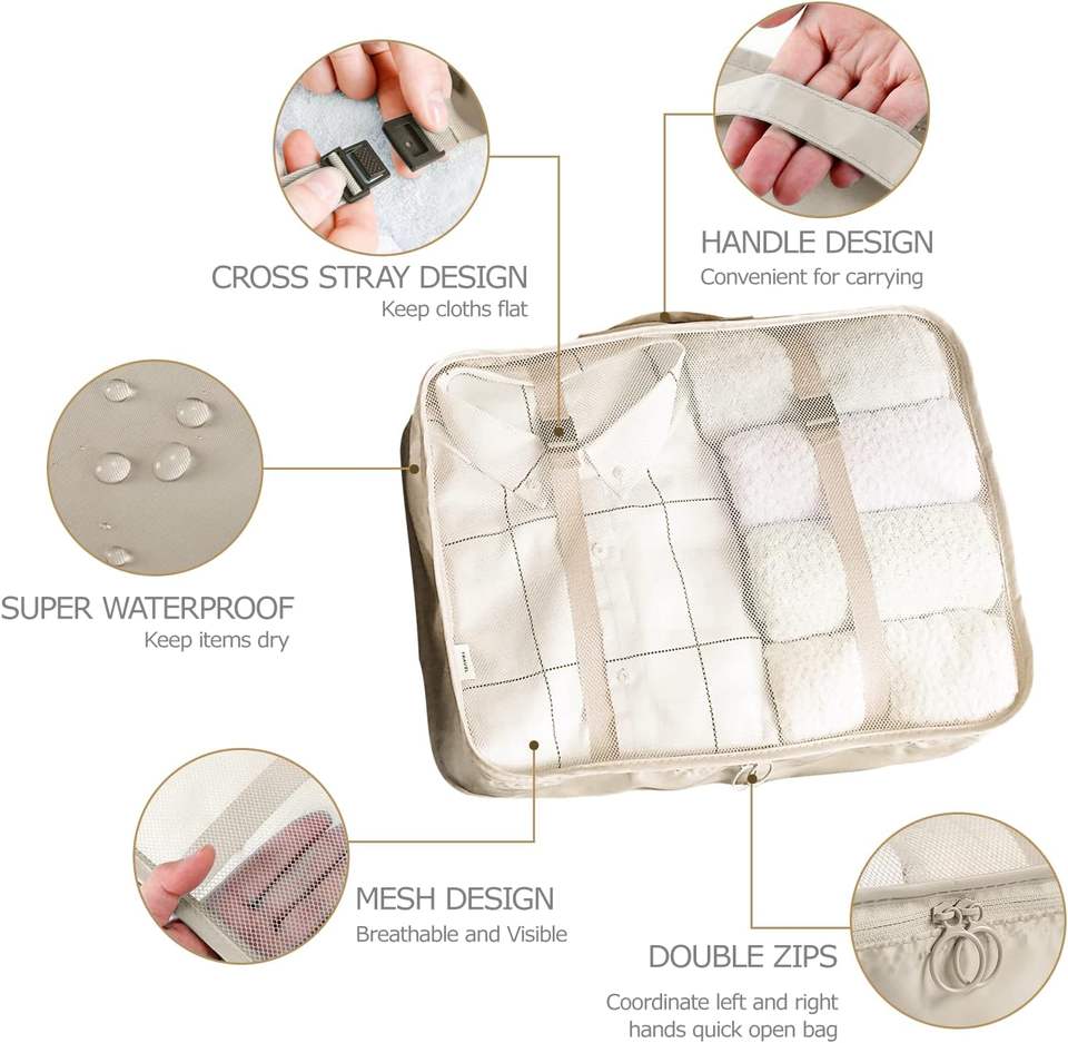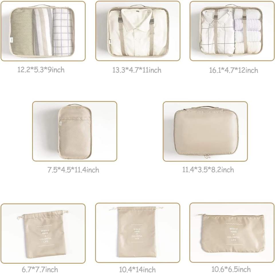 8 cubes de rangement pour valises, accessoires essentiels pour l'organisation des bagages de voyage, avec sac à chaussures, trousse de toilette et sac à linge.