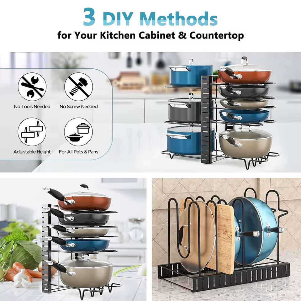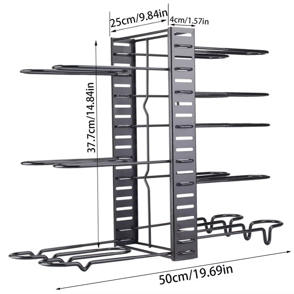 Réglable en hauteur: Permet de personnaliser le support pour s'adapter à différentes tailles de casseroles, poêles et autres ustensiles de cuisine, assurant une solution de rangement polyvalente et organisée.