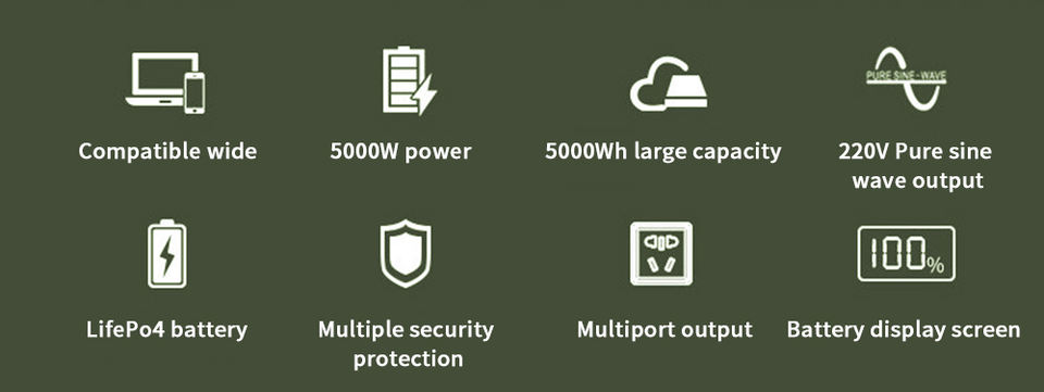 Lampe de poche, External battery, 220v/110V AC Port, Port d'USB, PORT DC 12V/10A, 24V/10A port, Port de sortie 48V/10AUsages spéciaux