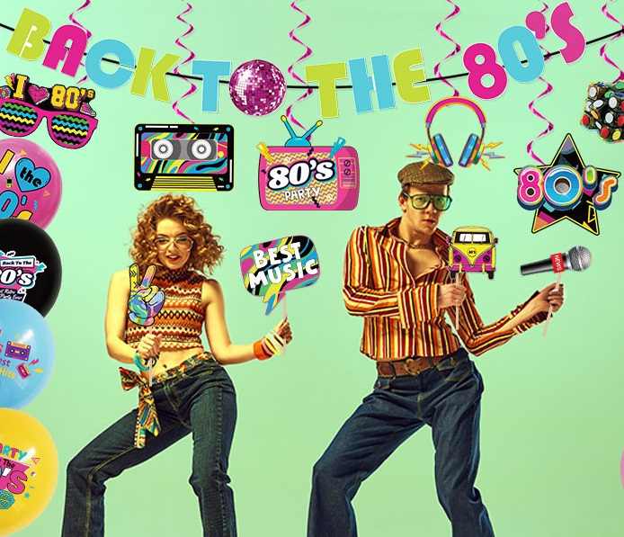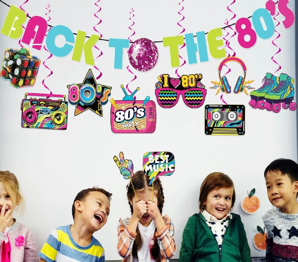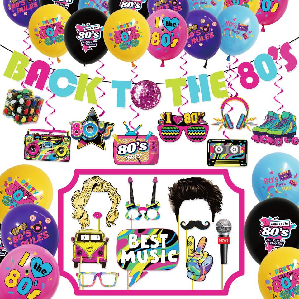 Décorations de fête des années 80 Retour aux années 80 Bannière à tourbillons suspendus Photo Prop Ballons pour anniversaire des années 1980 Neon Hip Hop Party Supplies