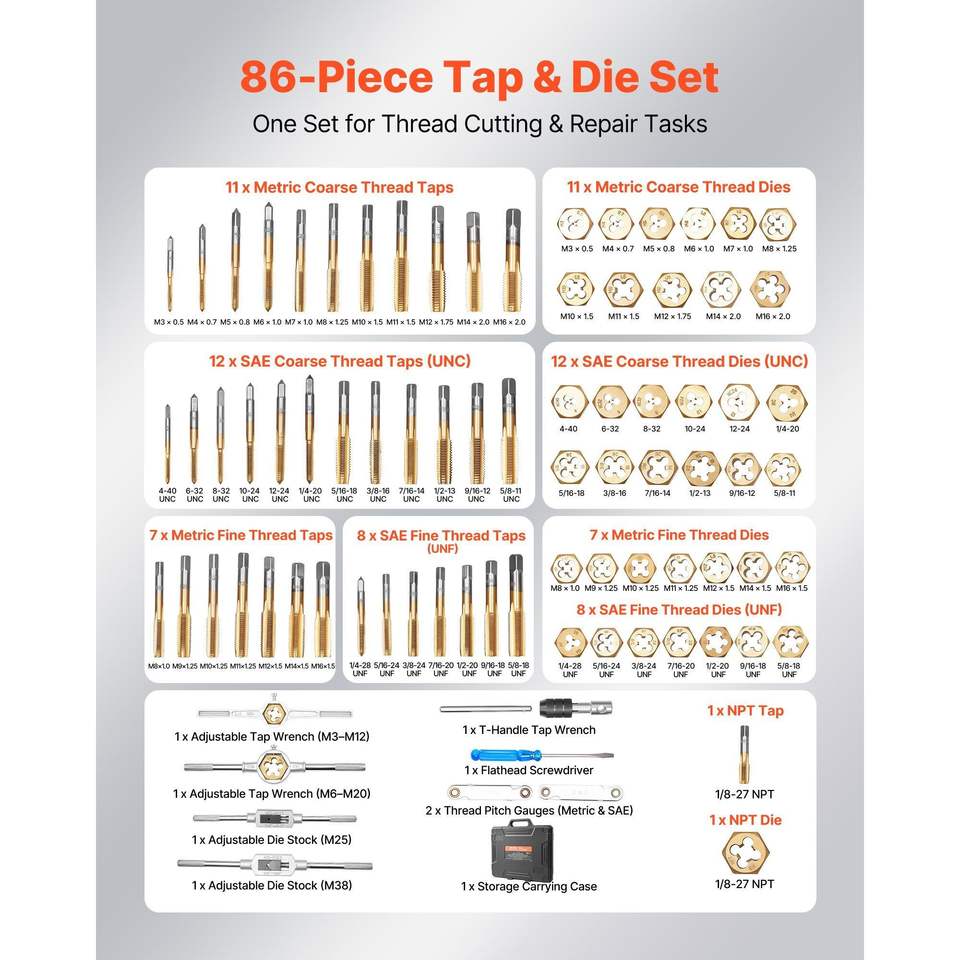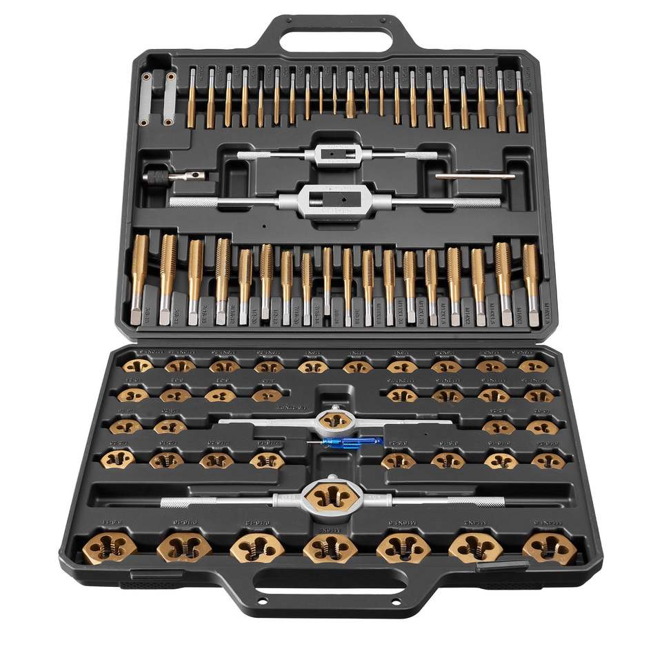 Jeu de tarauds et filières de 86 pièces pour tailles métriques et SAE de M3 à M12 # Jeu de tarauds et filières à filetage grossier et fin de 4 à 5/8 po avec clé et mallette de transport