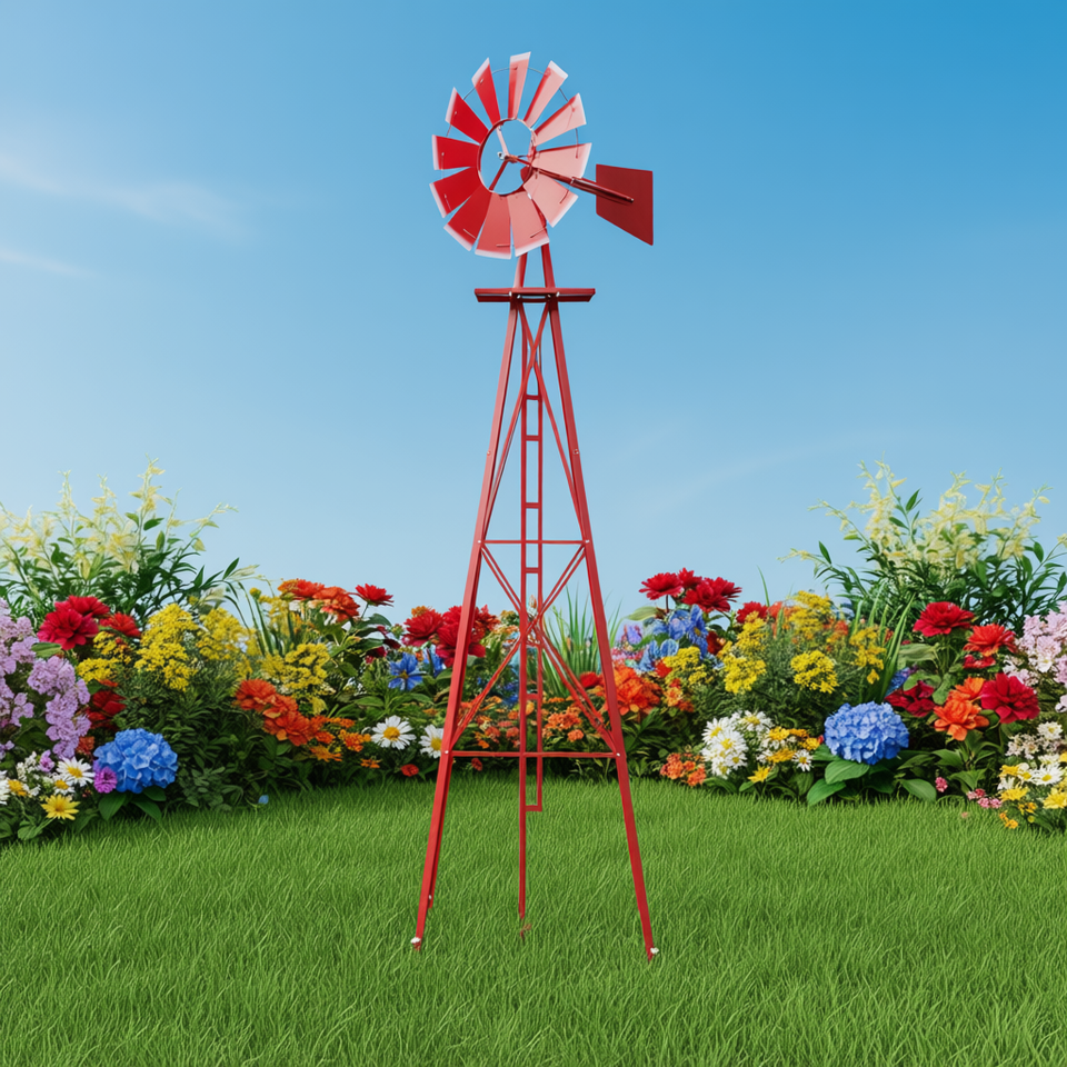 Ornement de jardin moulin à vent rouge de 2,4 m, résistant aux intempéries, en métal, décoration de jardin traditionnelle, installation par piquet extérieur