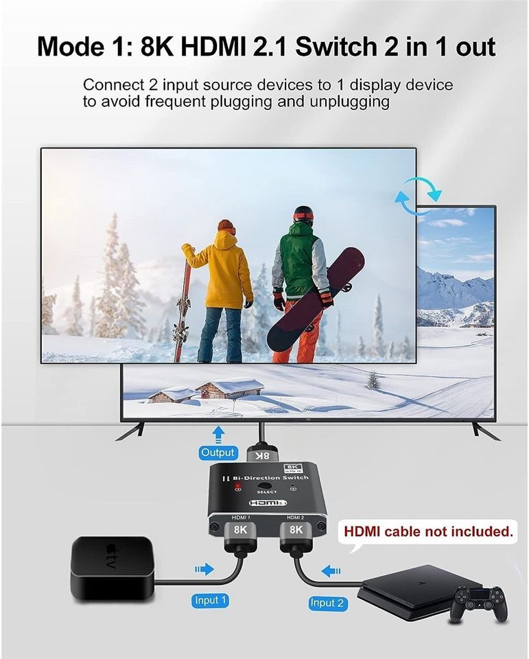 Commutateur HDMI 8K 60HZ, séparateur HDMI 4K 120Hz, commutateur bidirectionnel HDMI 2.1, convertisseur audio 2 entrées 1 sortie, 1x2 2x1 pour PS4 PS5 Xbox