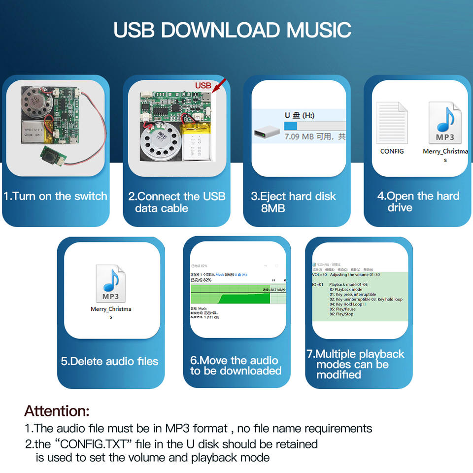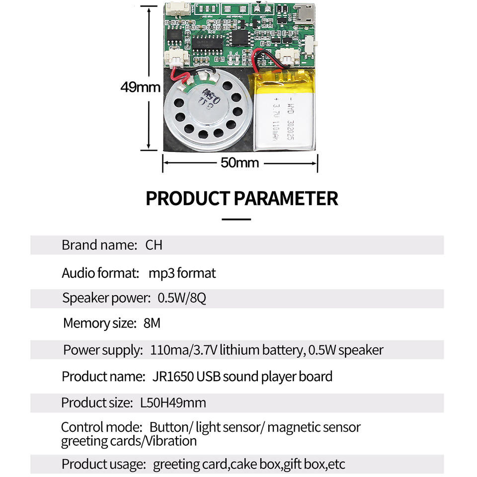 Module sonore PCB enregistrable MP3 8M avec téléchargement USB pour cartes de vœux de Noël/Nouvel An, haut-parleur à piles au lithium