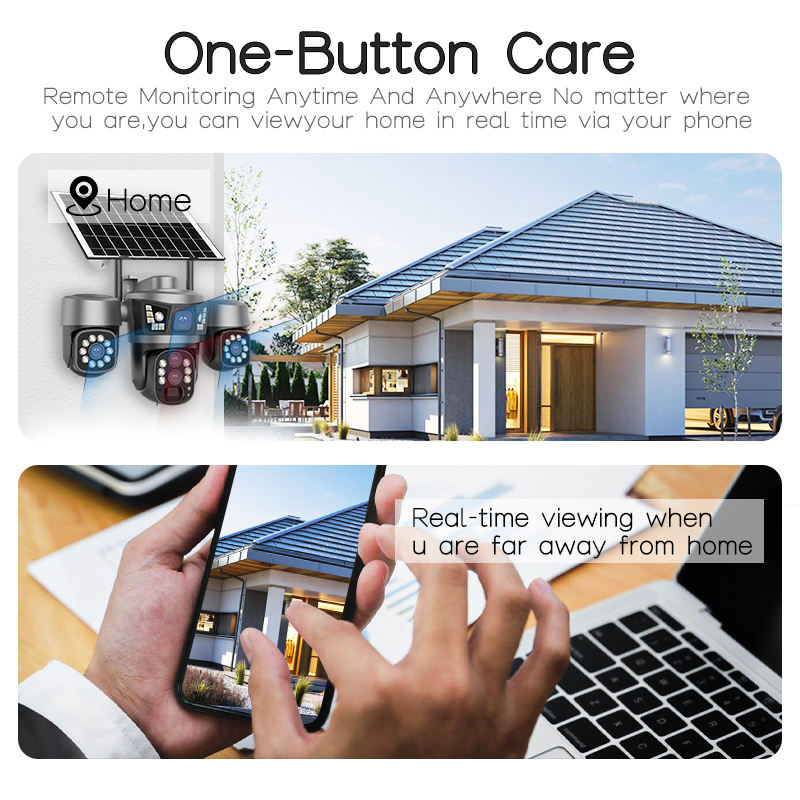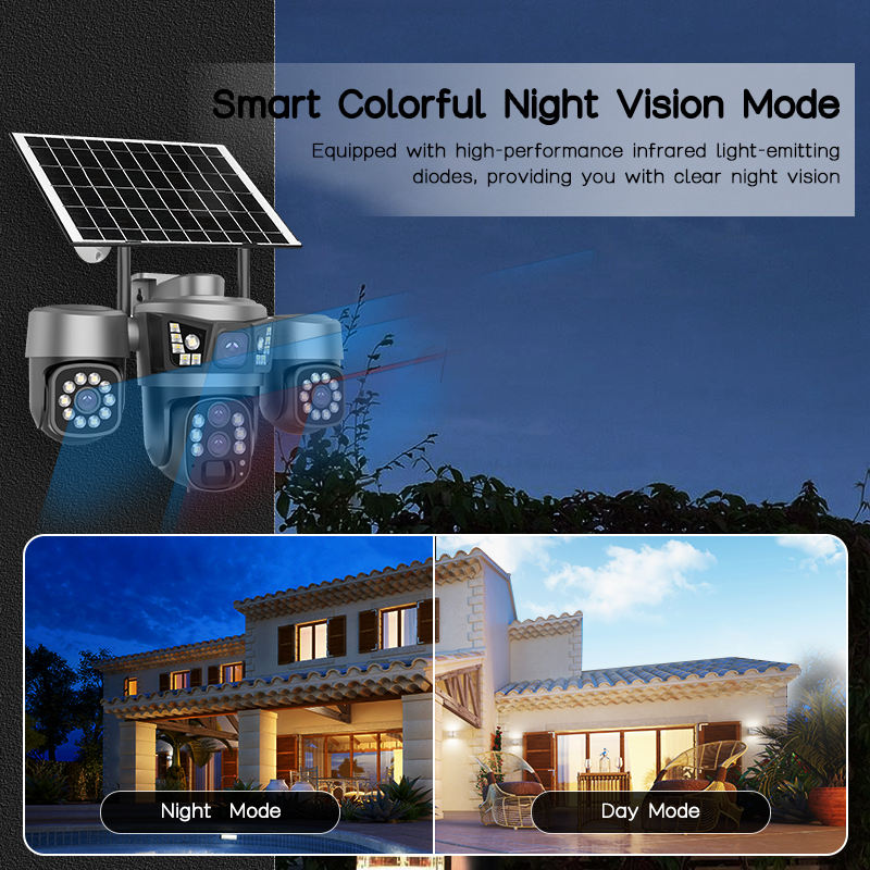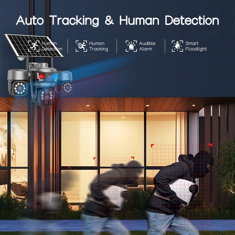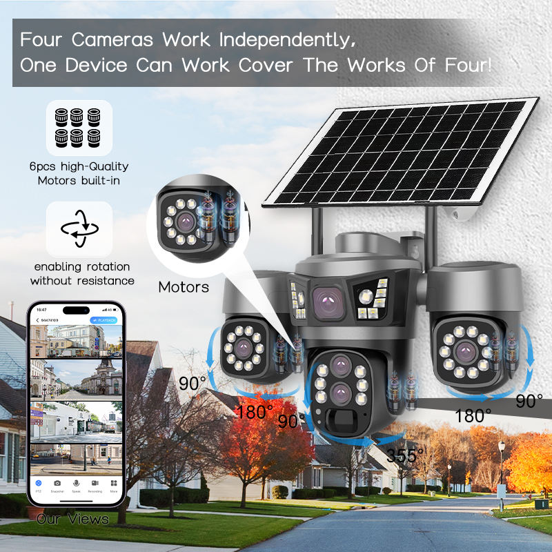 Caméra PTZ WiFi extérieure 8MP 1080P à quatre objectifs avec zoom 10x, suivi automatique, panoramique/inclinaison, vision nocturne couleur, audio bidirectionnel, compatible téléphone mobile