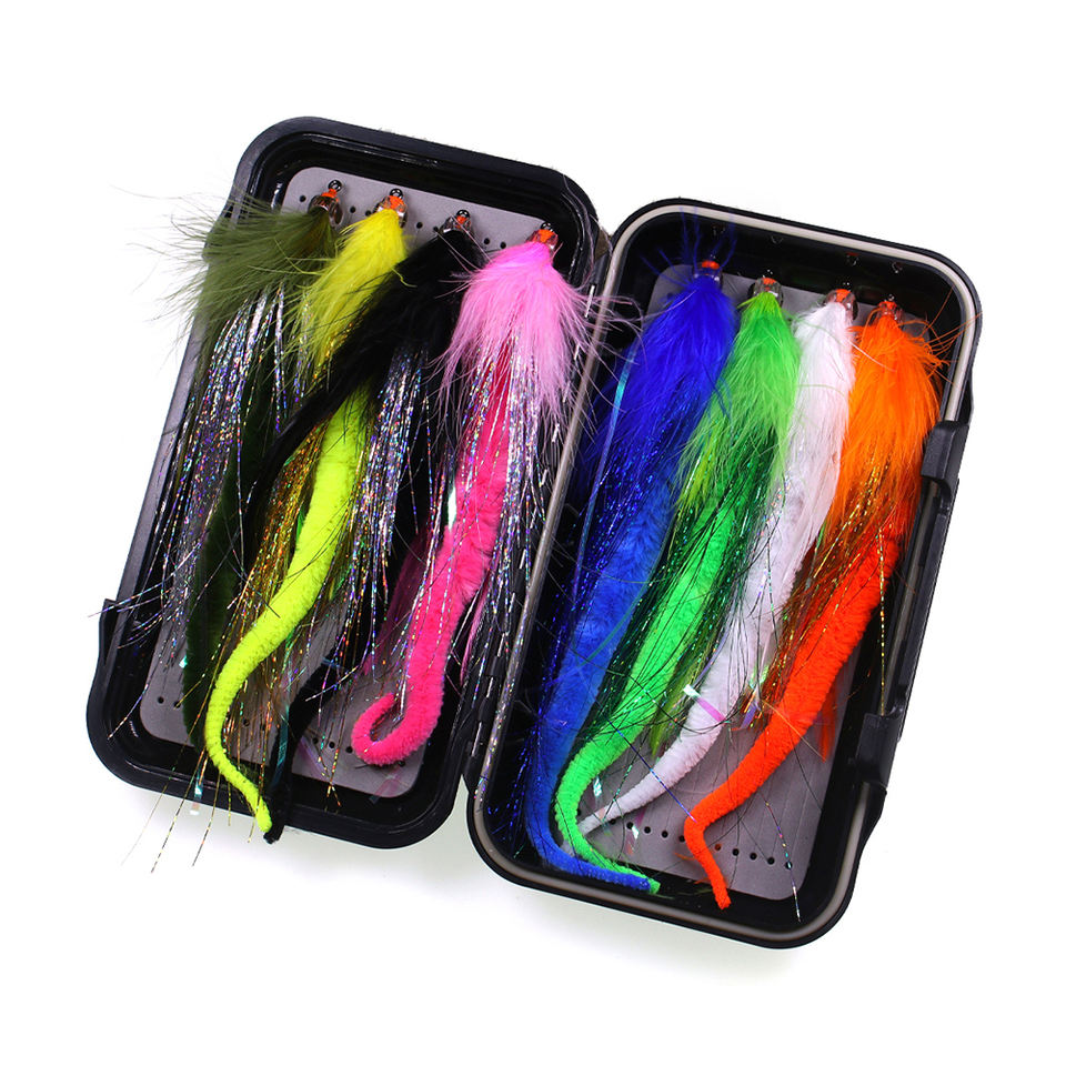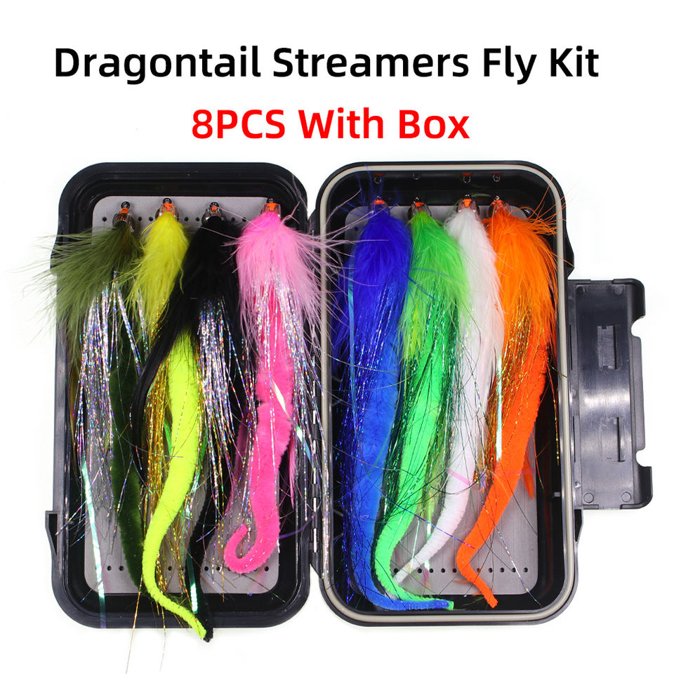 Kit de 8 leurres de pêche à la mouche Dragontail Streamer 2/0 avec boîte double face, gros appâts pour la pêche au brochet, au muskellunge et au bar rayé