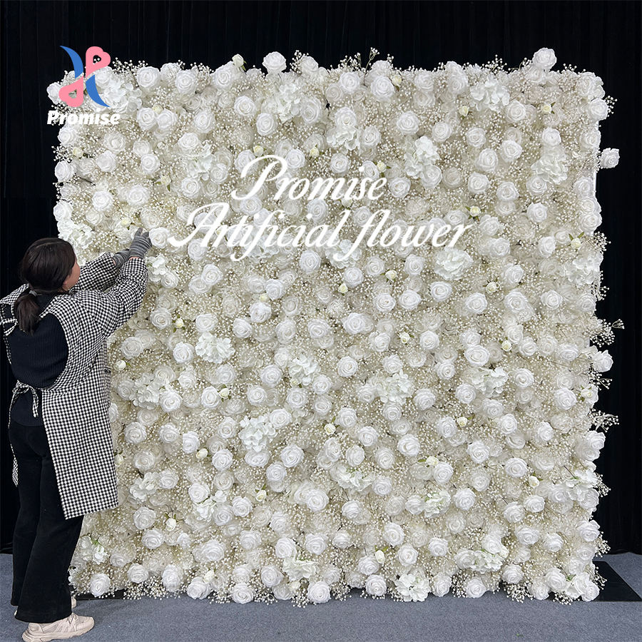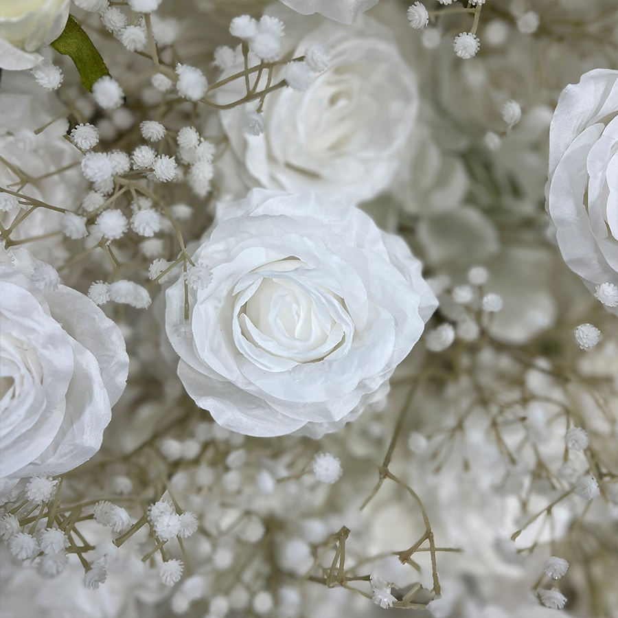 Toile de fond florale 3D 8x8 avec roses blanches brumeuses et souffle de bébé pour une décoration de mariage luxueuse
