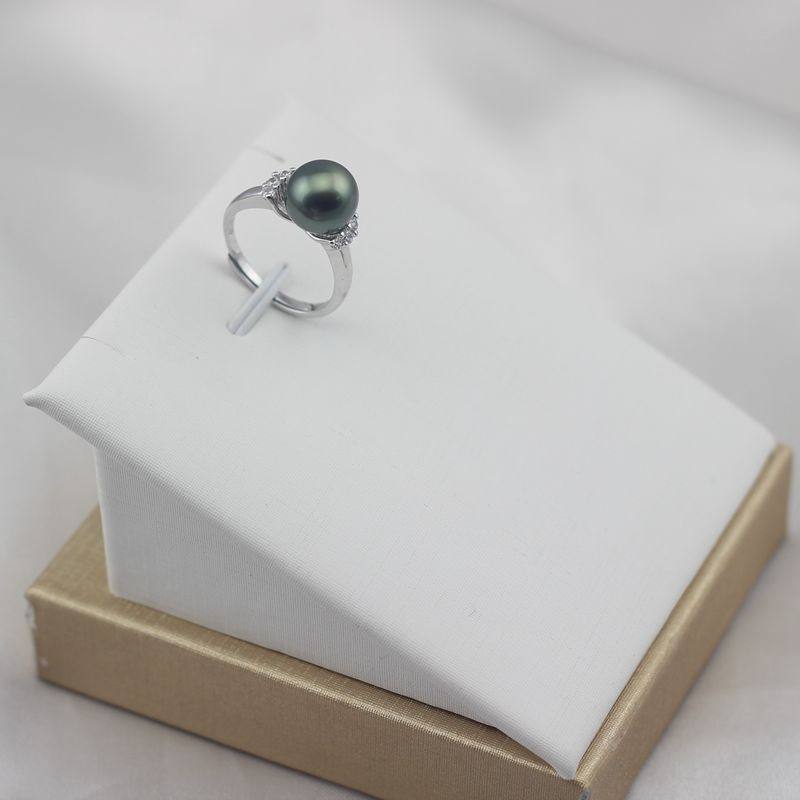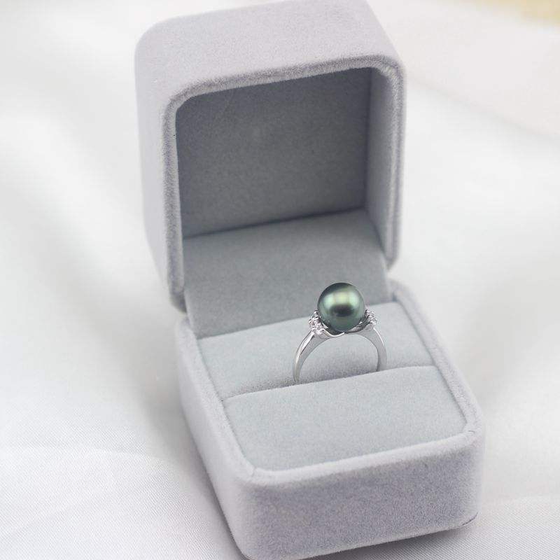 Bague en argent S925 réglable avec perle noire d'eau de mer ronde à haute brillance de 9-10 mm