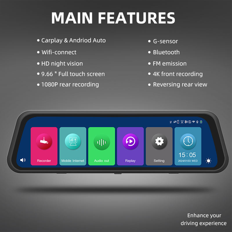 9.66 pouces HD IPS écran tactile voiture Dash Cam Vision nocturne 1080p Stream véhicule DVR avec 2 lentilles Wifi enregistrement en boucle