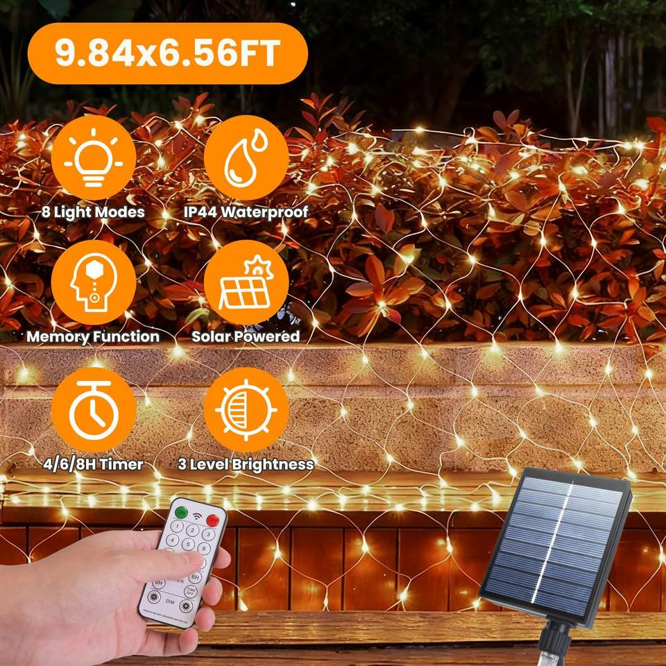 Guirlande lumineuse solaire de Noël 9,84x6,56FT 192 LED, dimmable, étanche IP44, pour extérieur, avec télécommande, minuterie, mémoire, 8 modes et fonctions ludiques