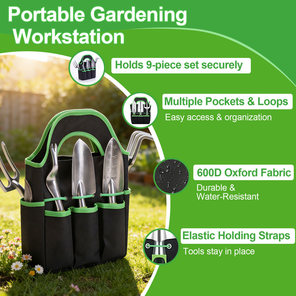 Ensemble complet d'outils de jardinage ergonomiques de 9 pièces, comprenant un désherbeur, une taille-haie, un repiqueur, une truelle, un râteau et un sac