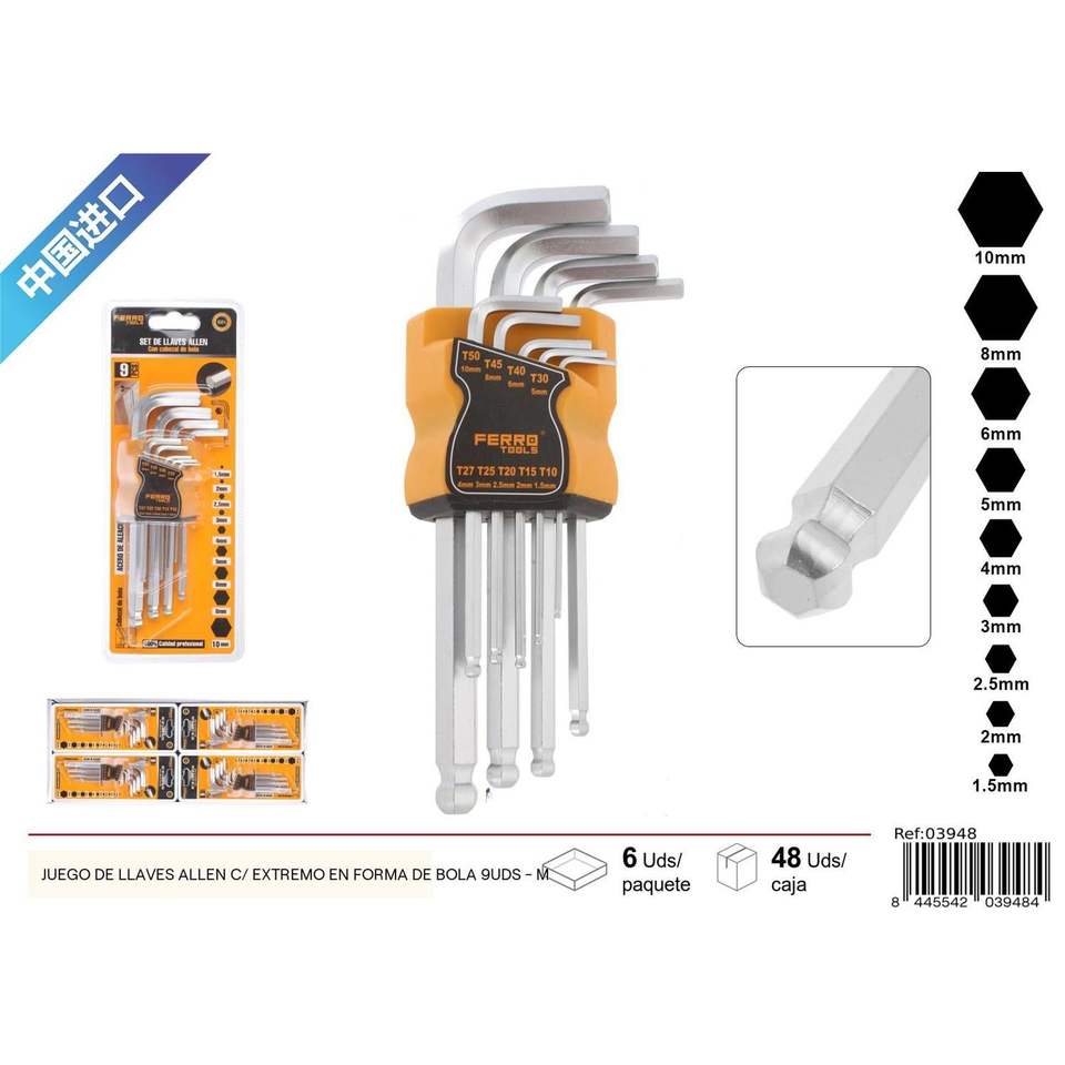 Jeu de clés Allen à bout sphérique de 9 pièces pour jeux d'outils