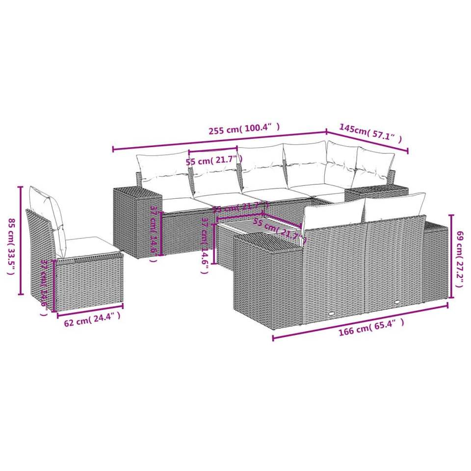 Ensemble de canapés de patio en polyrotin noir, 9 pièces, avec coussins, meubles d'extérieur élégants
