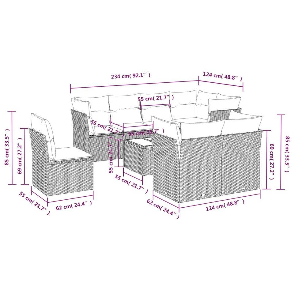 Ensemble de 9 canapés de patio en poly rotin gris avec coussins Mobilier d'extérieur durable
